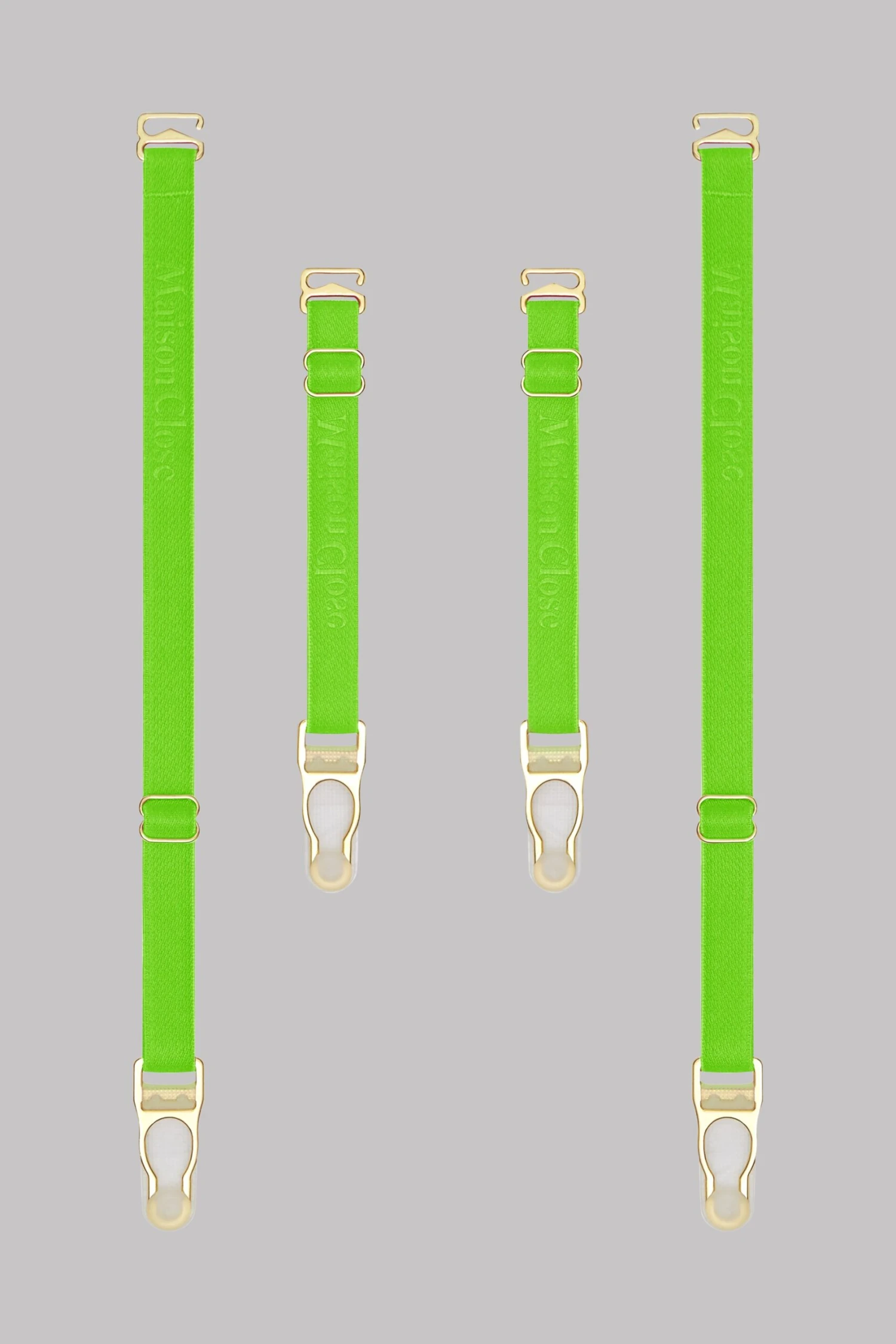 Cette ligne tendance et pétillante propose des bretelles pour soutien-gorge, des bretelles pour body, des élastiques pour string, des jarretelles et des harnais, déclinés en 4 coloris.