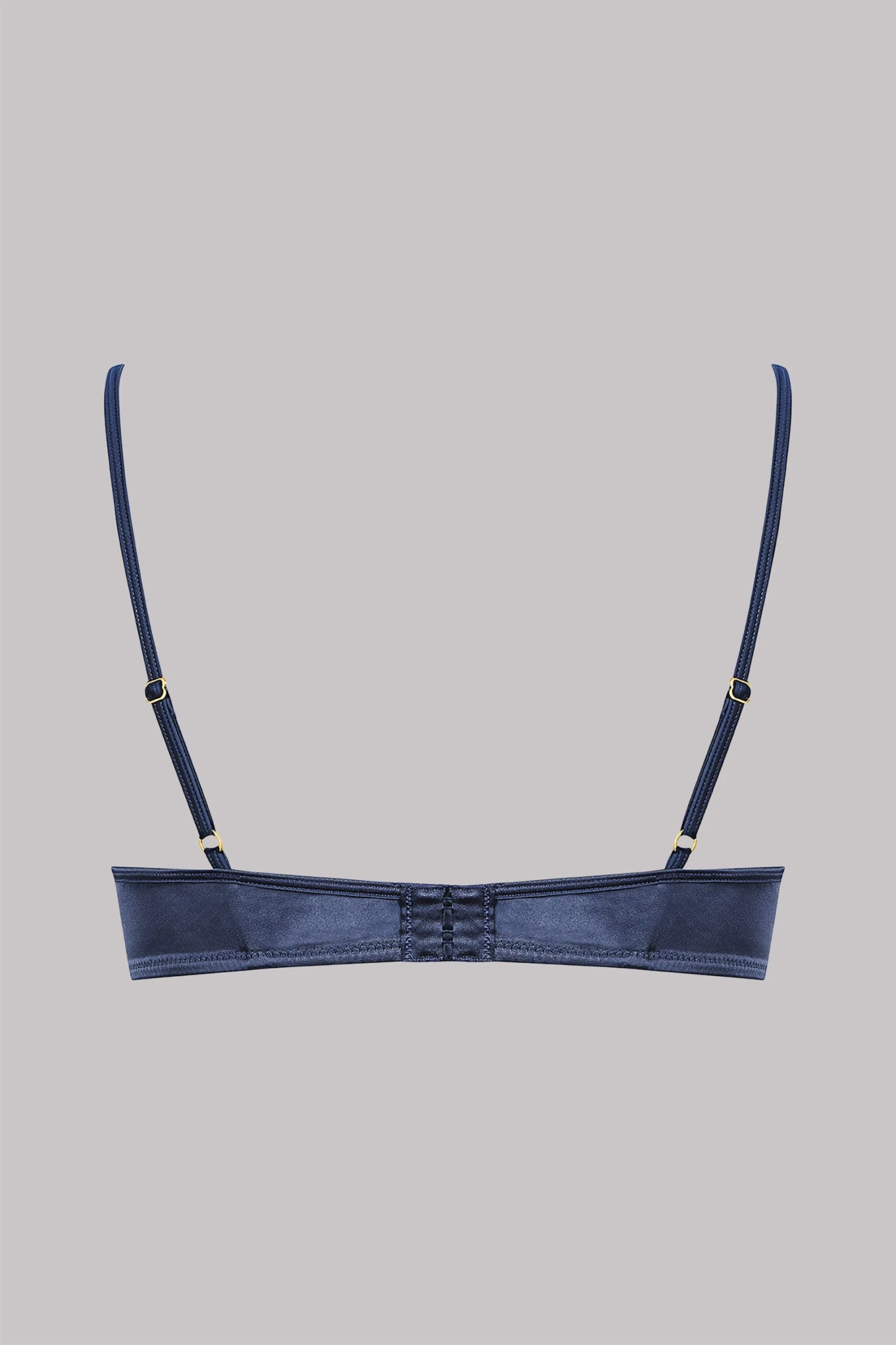 Un mariage iconique d’une dentelle à cils incroyablement fine et du satin bleu marine. Cette collection poétique à la délicate transparence, esquisse des arabesques sur la peau tout en offrant la promesse d’être audacieuse.