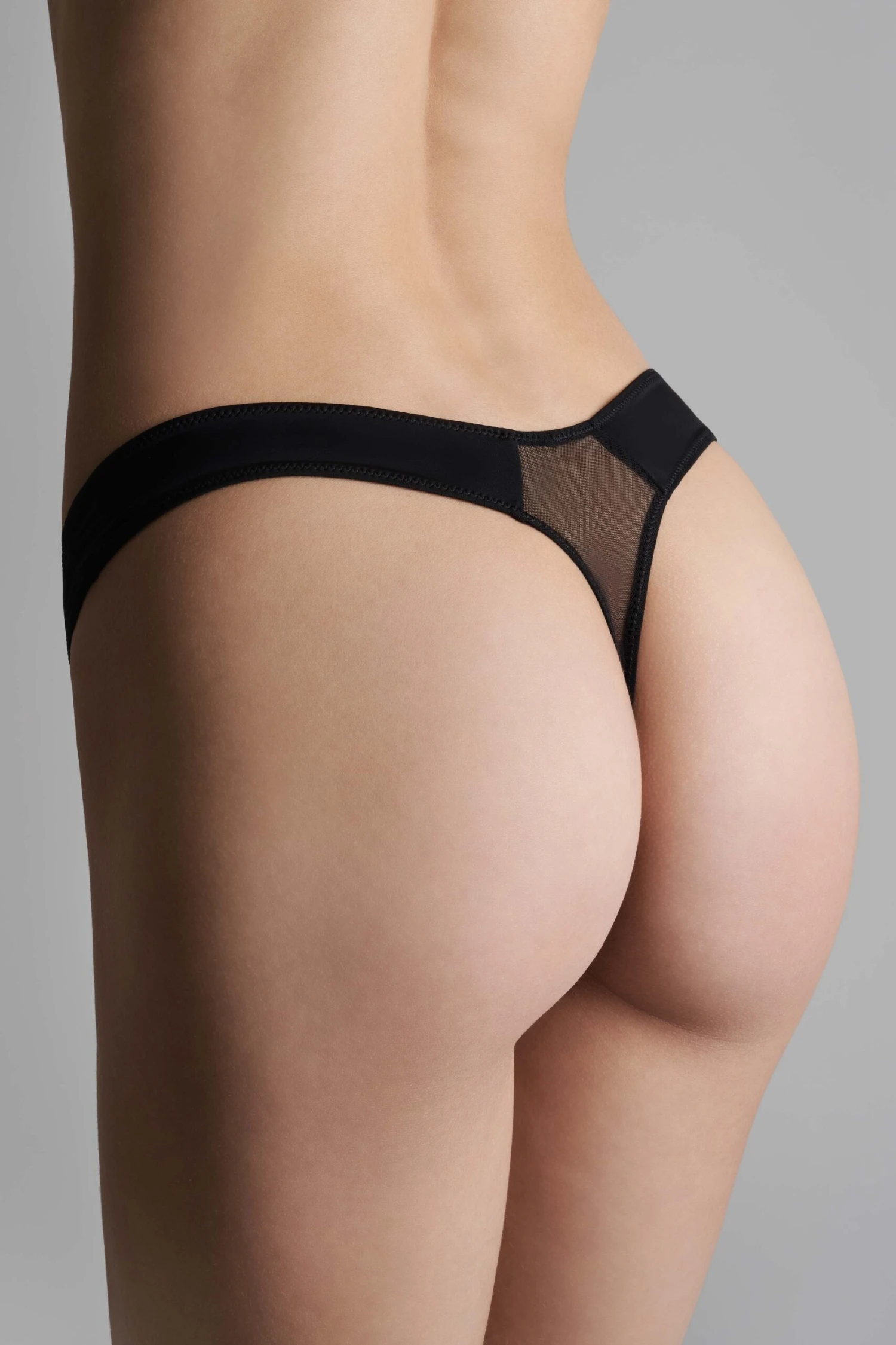 String échancré en microfibre semi opaque avec empiècement en tulle transparent. Échancrure accentuée par une découpe graphique et un jeu de transparence. Empiècement de tulle dans le creux des reins.